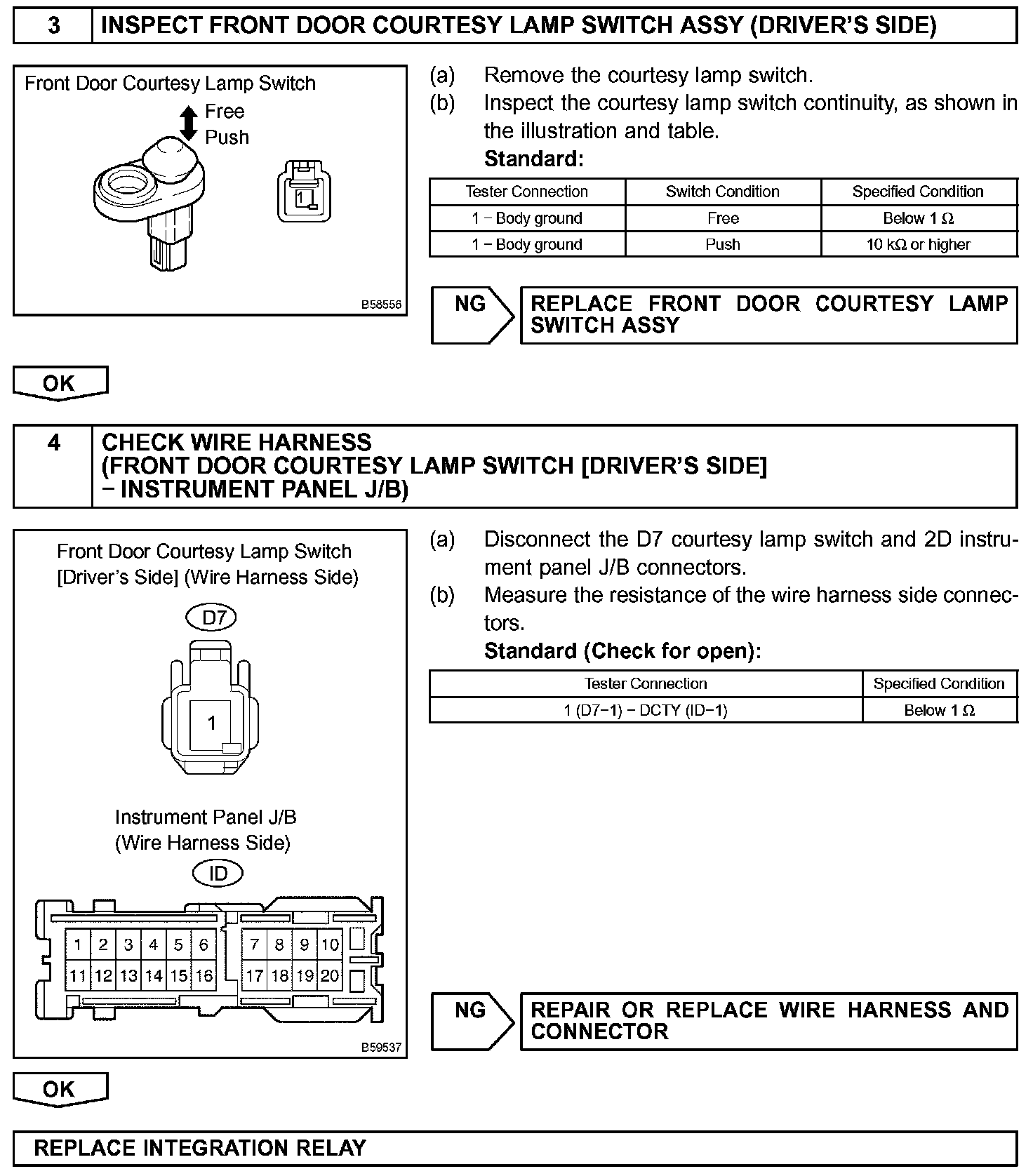 The unlock warning switch turns on when the key is inserted into the ignition key cylinder and the door courtesy switch turns on when the driver side door is opened. The integration relay monitors the condition of both switches. If the integration relay detects that both the unlock warning switch and door courtesy switch are on, the integration relay prevents door lock operations so that the key cannot be locked in the vehicle.