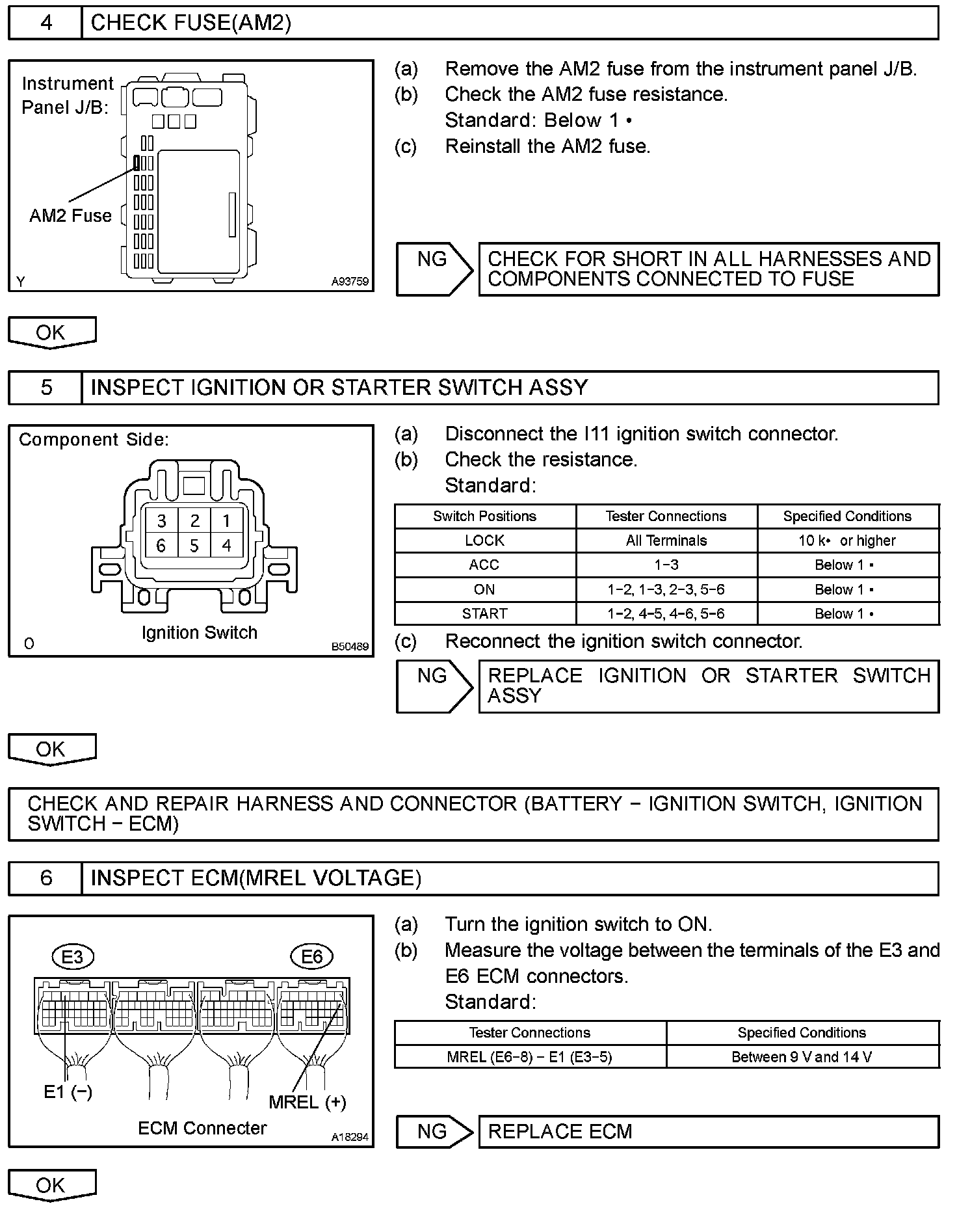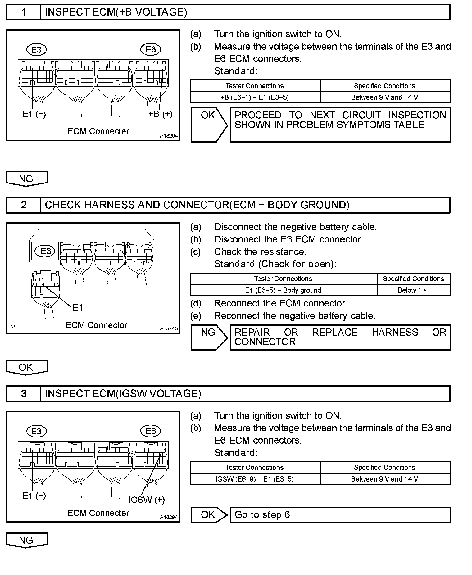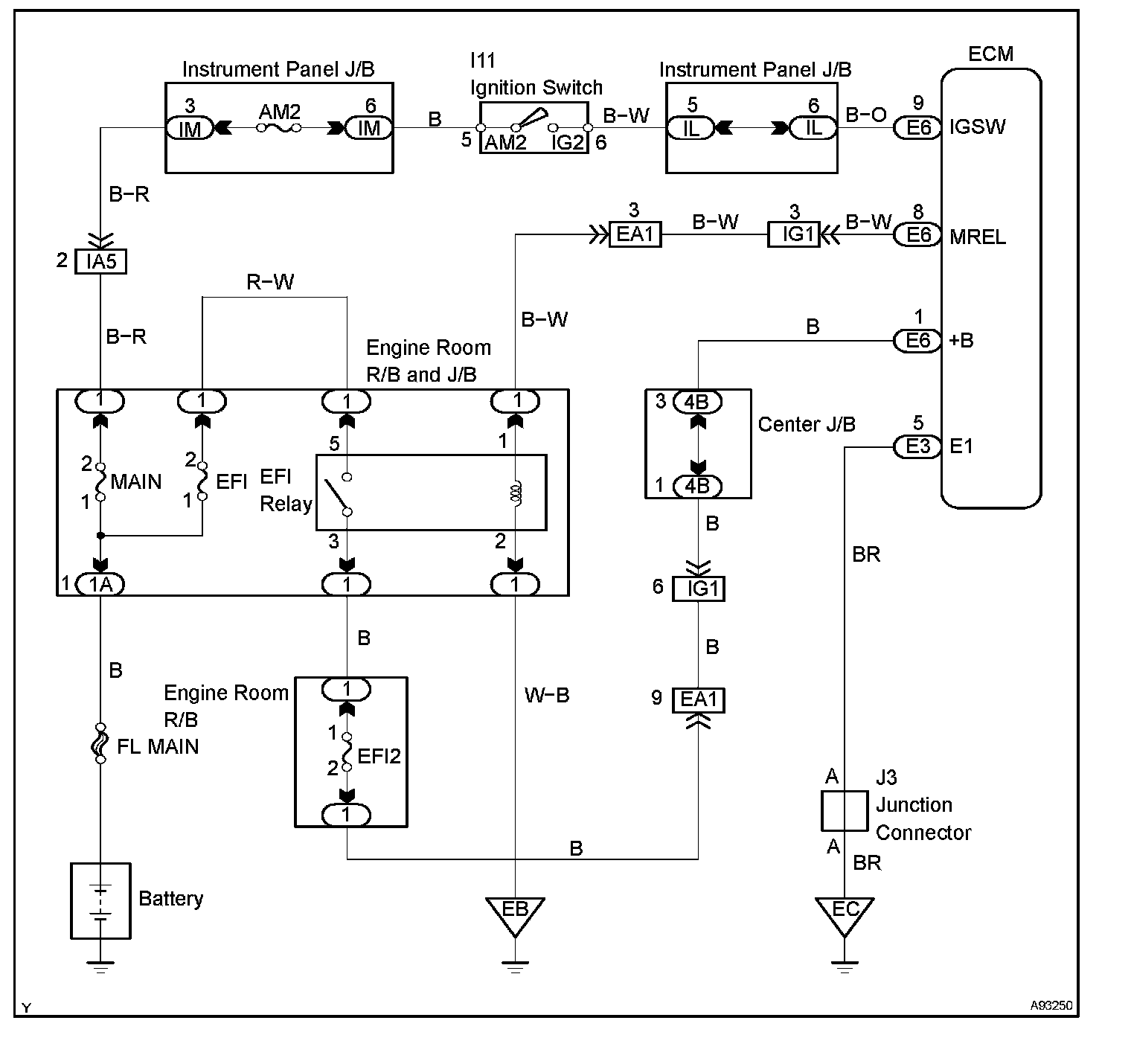 When the ignition switch is turned to ON, battery voltage is applied to terminal IGSW of the ECM. The ECM MREL output signal causes current to flow to the coil, closing the contacts of the EFI relay and supplying power to terminal +B of the ECM.