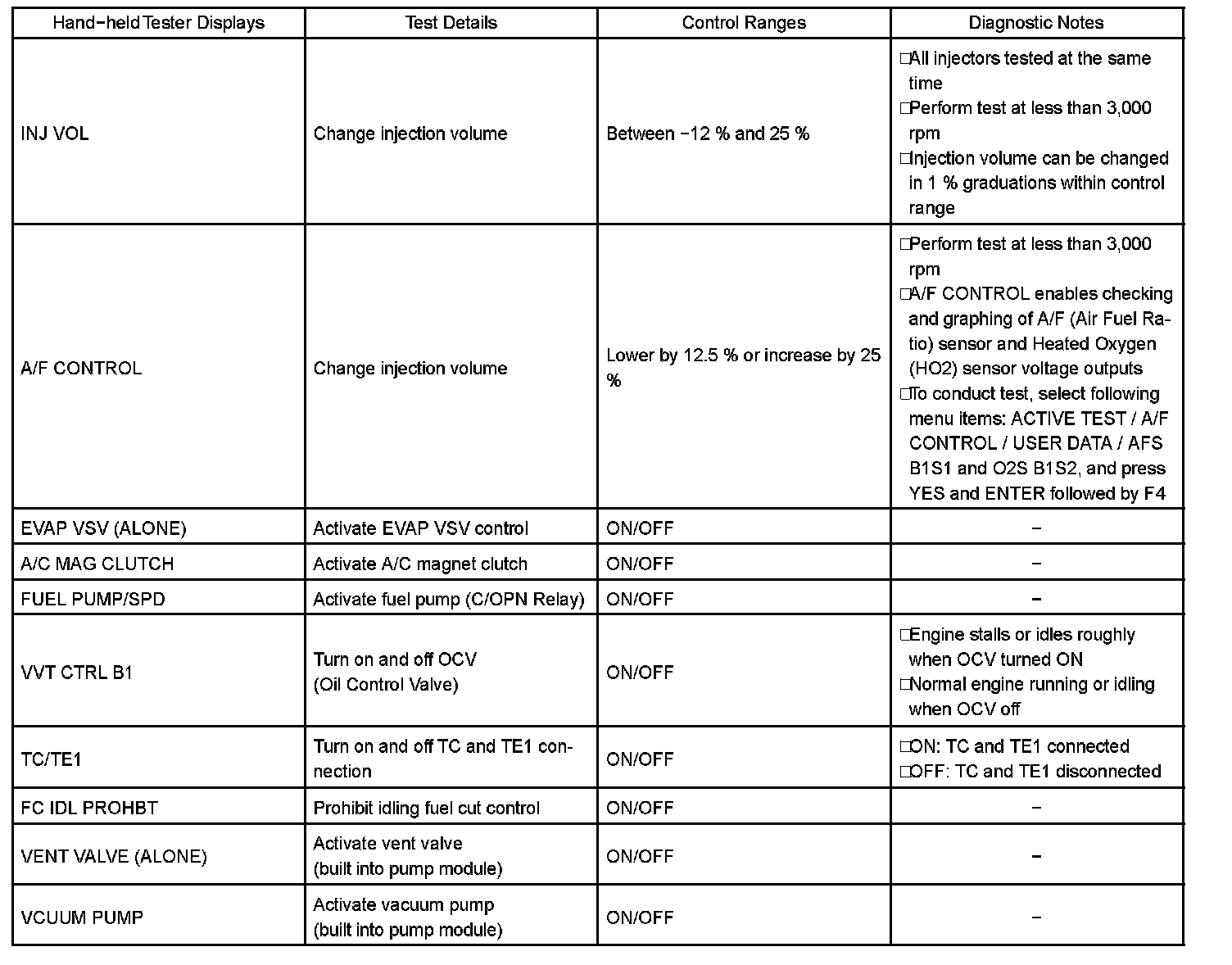 HINT: Performing an ACTIVE TEST enables components including the relays, VSV (Vacuum Switching Valve), and actuators, to be operated without removing any parts. The ACTIVE TEST can be performed with a hand-held tester. Performing an ACTIVE TEST as the first step of troubleshooting is one method of shortening diagnostic time.