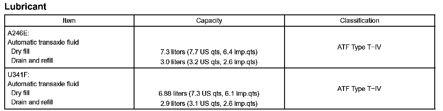 When changing the automatic transmission fluid, use only "Toyota Genuine ATF Type T-IV" (ATF JWS3309 or NWS6500) to aid in assuring optimum transmission performance.