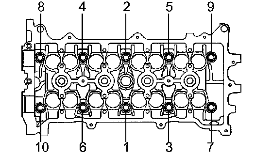 Using several steps, uniformly install and tighten the 10 cylinder head bolts and plate washers with a bi-hexagon wrench 10 mm in the sequence shown in the illustration.