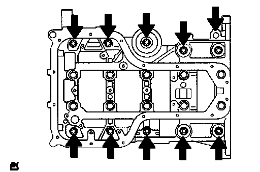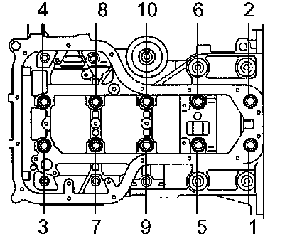 c) Uniformly loosen the 10 bearing cap bolts, in several passes in the sequence shown in the illustration.