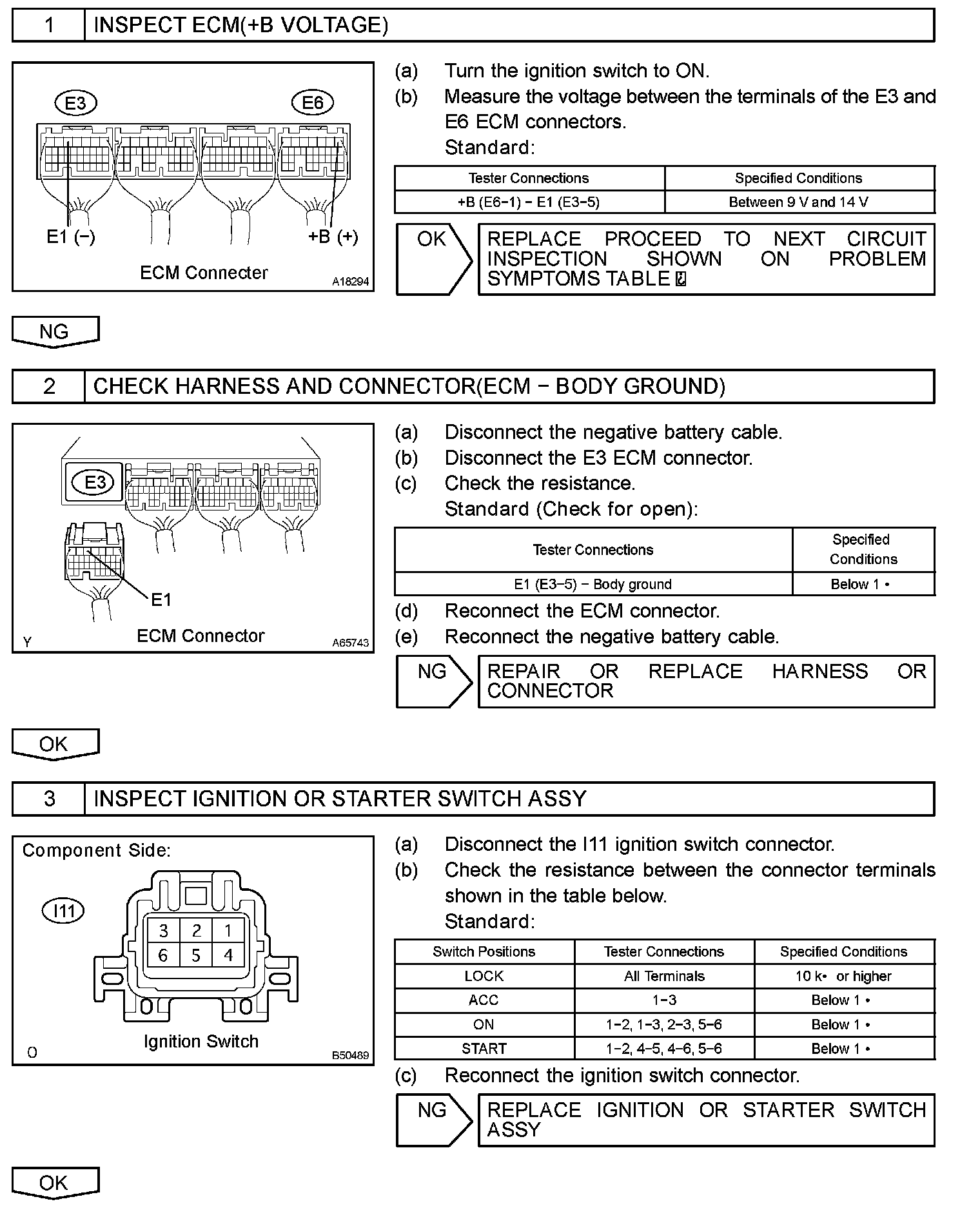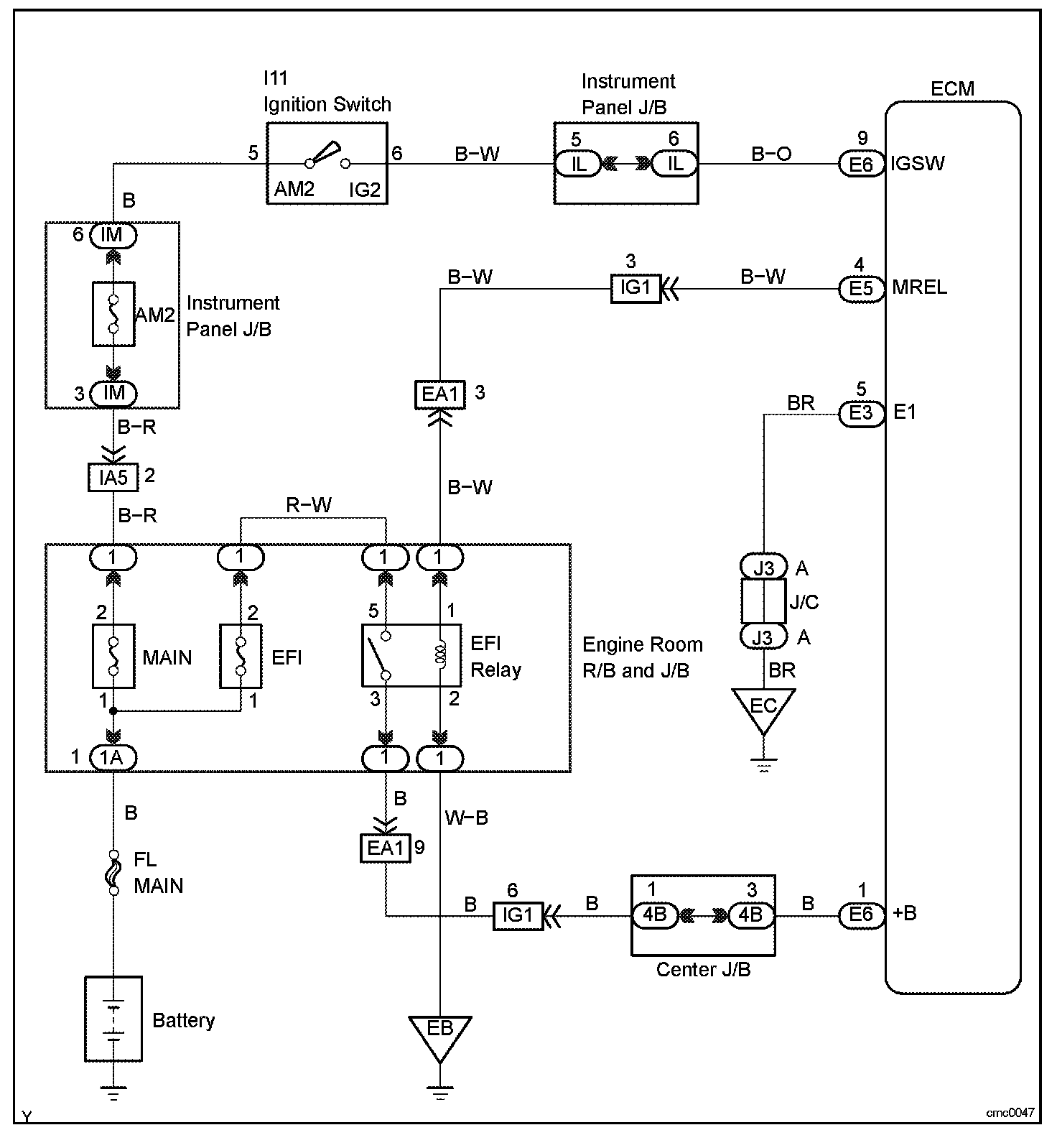When the ignition switch is turned to ON, the battery voltage is applied to terminal IGSW of the ECM. The ECM MREL output signal causes a current to flow to the coil, closing the contacts of the EFI relay and supplying power to terminal +B of the ECM.