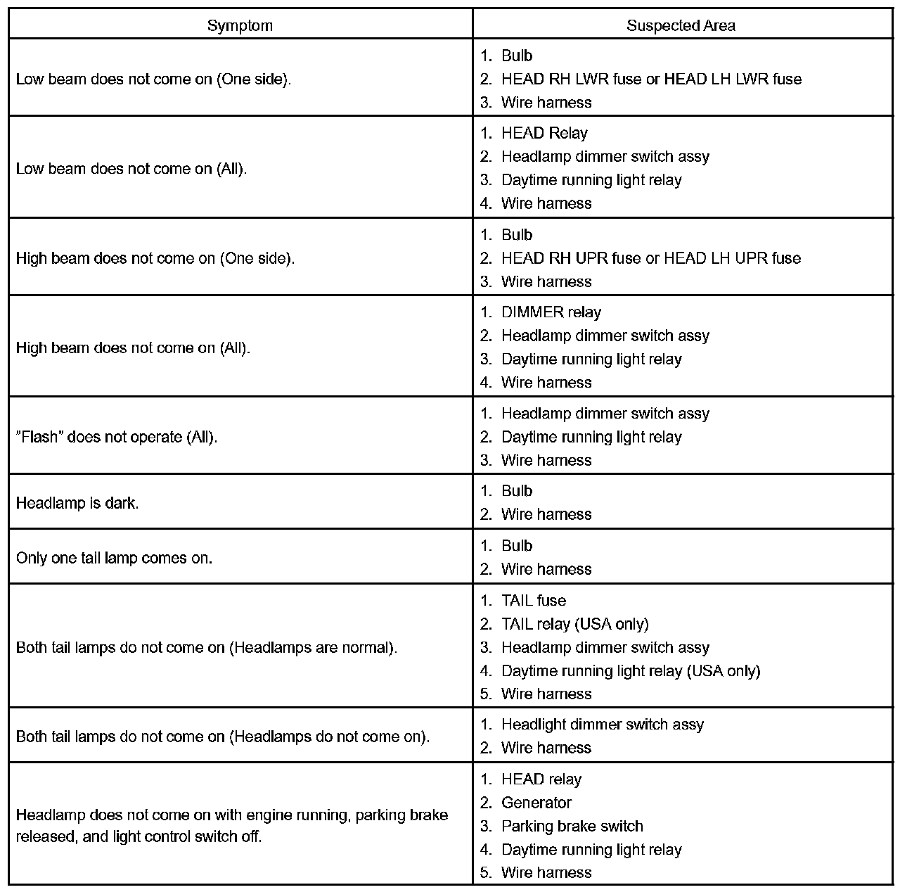 Problem Symptoms Table - Head Lamp And Tail Lamp: