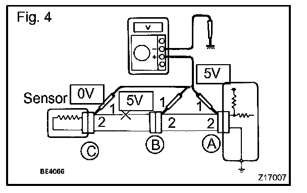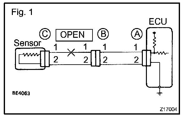 CHECK OPEN CIRCUITa. For an open circuit in the wire harness in Fig. 1, perform a resistance check (step b) or a voltage check (step c).