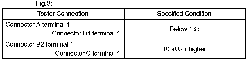 If your results match the examples above, an open circuit exists in the wire harness between terminal 1 of connector B and terminal 1 of connector C.
