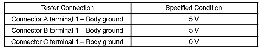 With each connector still connected, measure the voltage between the body ground and these terminals (in this order): 1) terminal 1 of connector A at the ECU 5 V output terminal, 2) terminal 1 of connector B, and 3) terminal 1 of connector C.