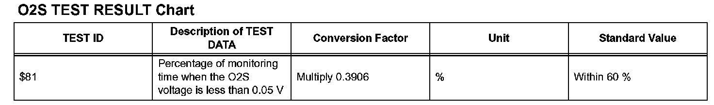 In this diagnostic information, the description of the O2S TEST RESULT (for O2S related DTCs) are written in a table. This table consists of 5 items: