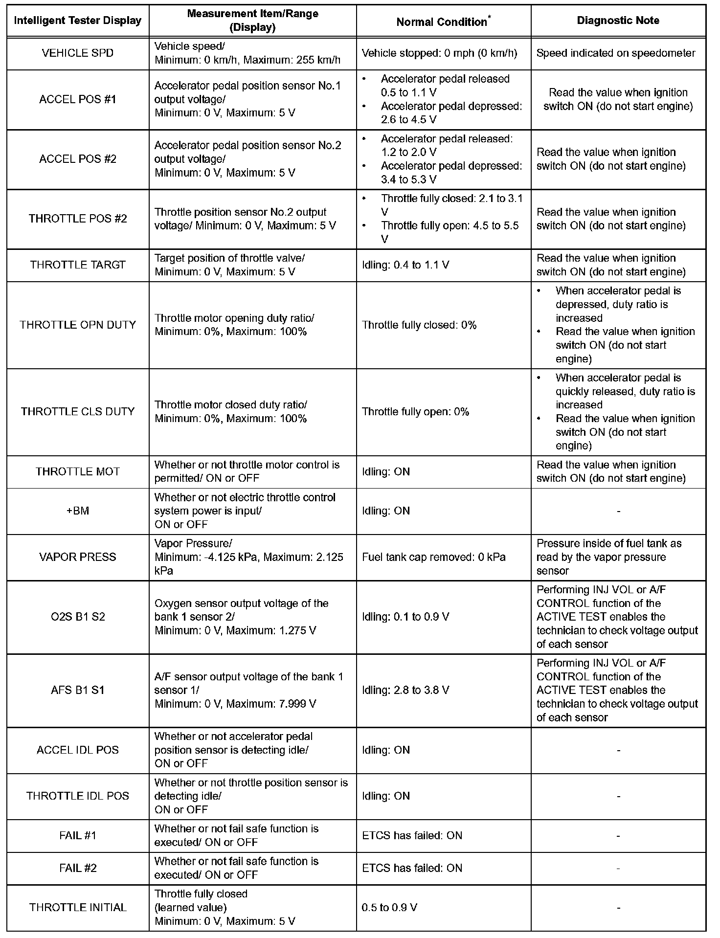 NOTE: In the table given, the values listed under "Normal Condition" are reference values. Do not depend solely on the these reference values when deciding whether a part is faulty or not.