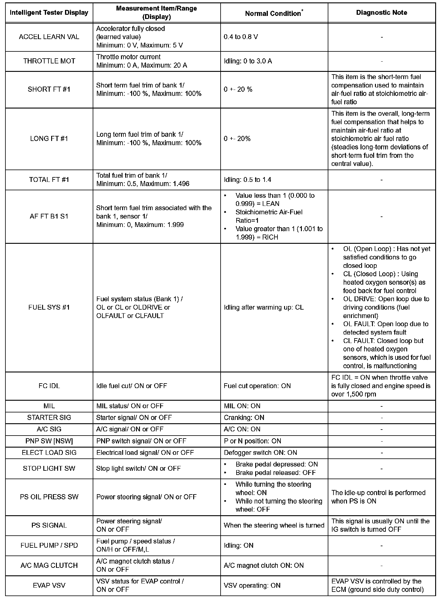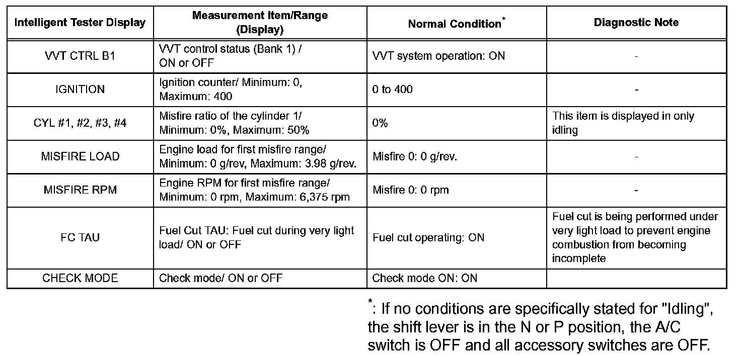 DATA LISTHINT: Using the intelligent tester's DATA LIST allows switch, sensor, actuator and other item values to be read without removing any parts. Reading the DATA LIST early in troubleshooting is one way to shorten labor time.