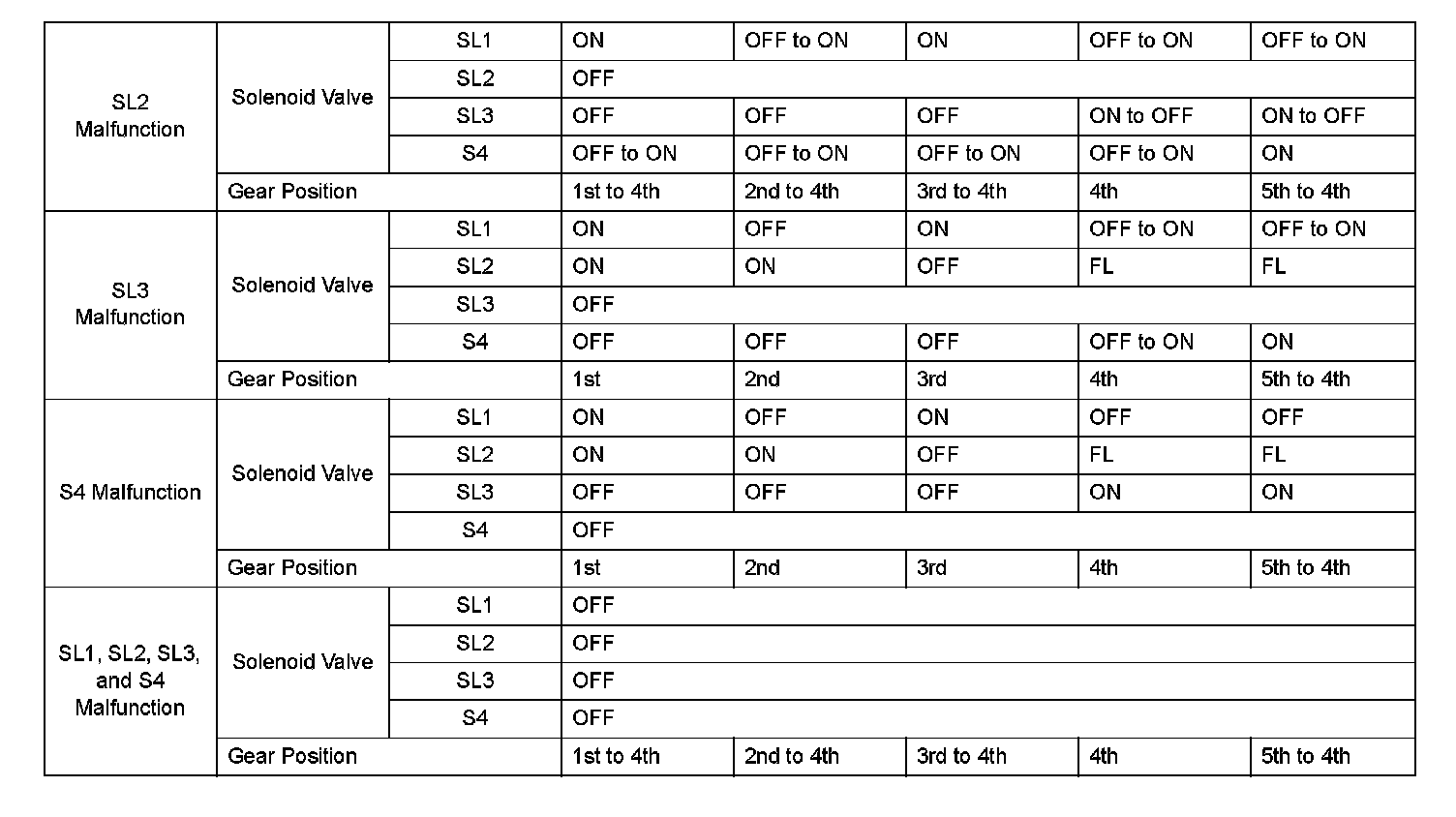 If either of the shift solenoid valve circuits develops an open or short, the ECM turns the other shift solenoid ON and OFF in order to shift into the gear positions shown in the table.