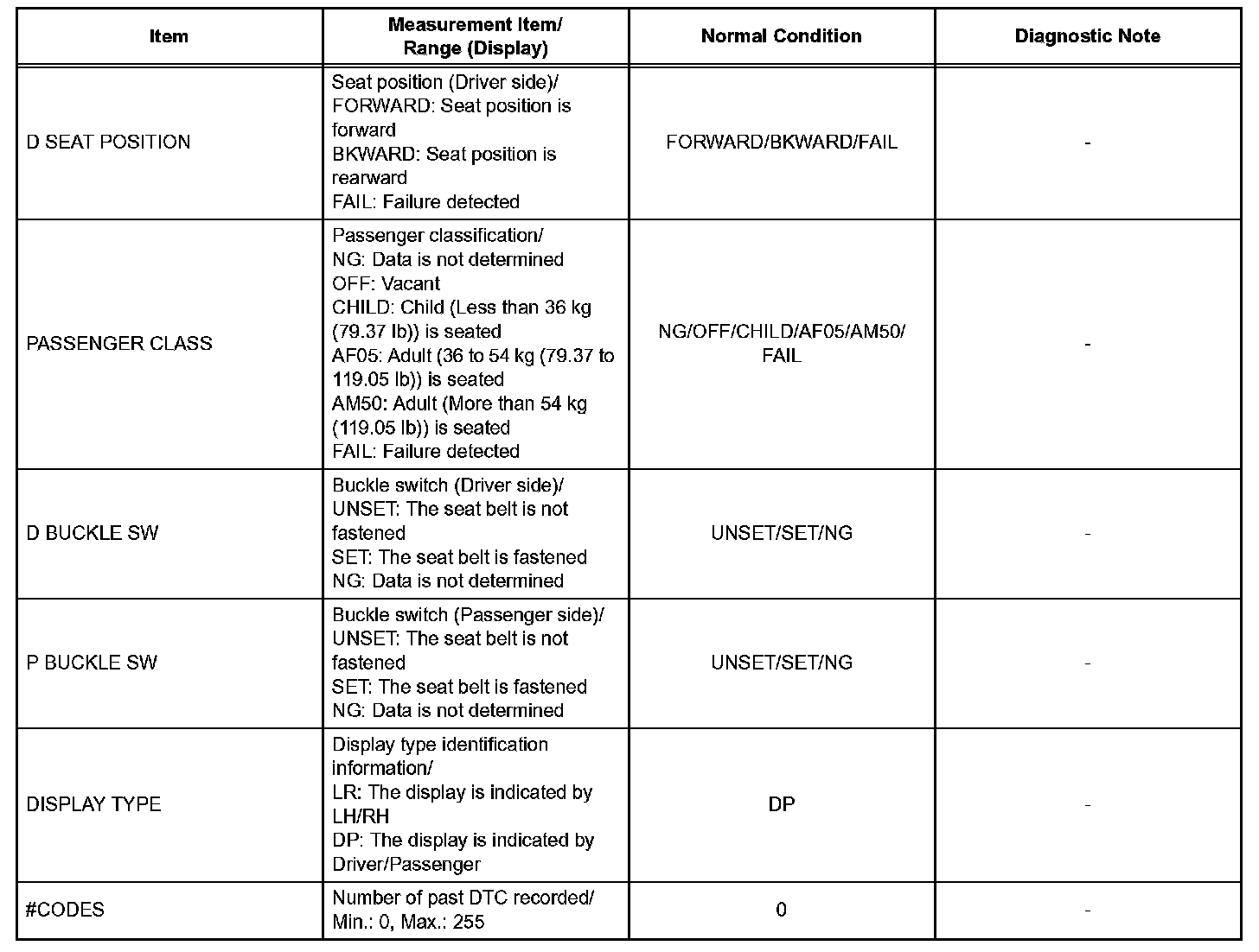 1. DATA LIST FOR CENTER AIRBAG SENSOR ASSEMBLY