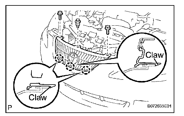 b. Using a screwdriver, disengage the 3 claws and remove the radiator grille.