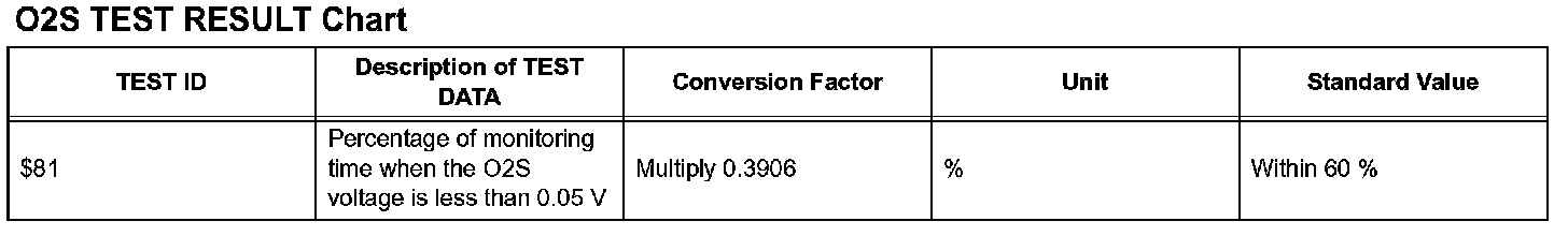 In this diagnostic information, the description of the O2S TEST RESULT (for O2S related DTCs) are written in a table. This table consists of 5 items: