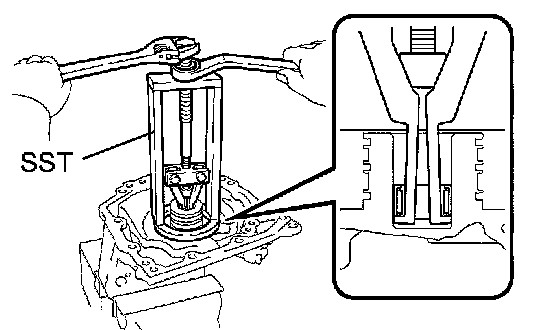 ^ Stop the press when the spring sheet is lowered 1 - 2 mm (0.039 - 0.078 inch) from the snap ring groove, to prevent the spring sheet from deforming.