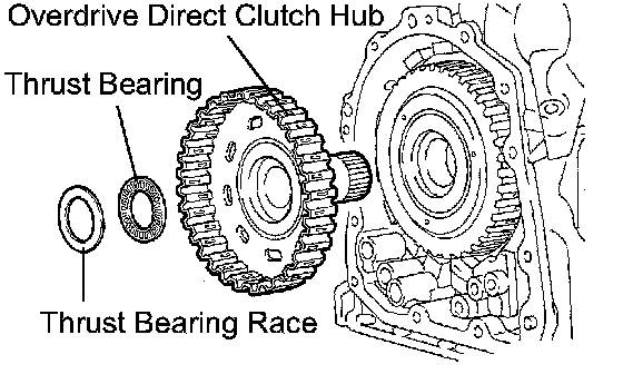 a. Remove the thrust bearing race, thrust bearing and overdrive direct clutch hub from the planetary gear assembly.