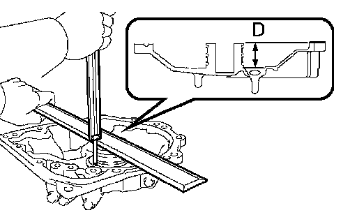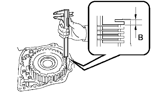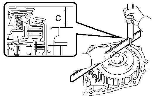d. As shown in the illustration, place a straight edge on the direct clutch drum and measure the distance between transaxle case and the straight edge using vernier calipers (Dimension C).