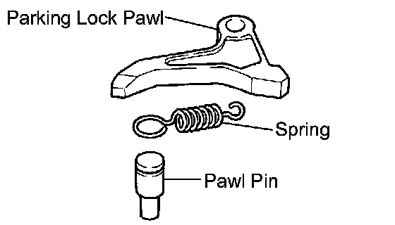 b. Temporarily install the parking lock pawl, shaft and spring to the transaxle case, as shown in the illustration.