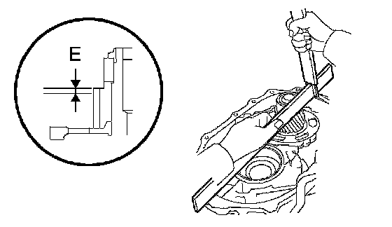 d. Using a straight edge and vernier calipers as shown in the illustration, measure the gap between the top of the differential drive pinion in the underdrive planetary gear and contact surface of the transaxle case and housing (Dimension E).