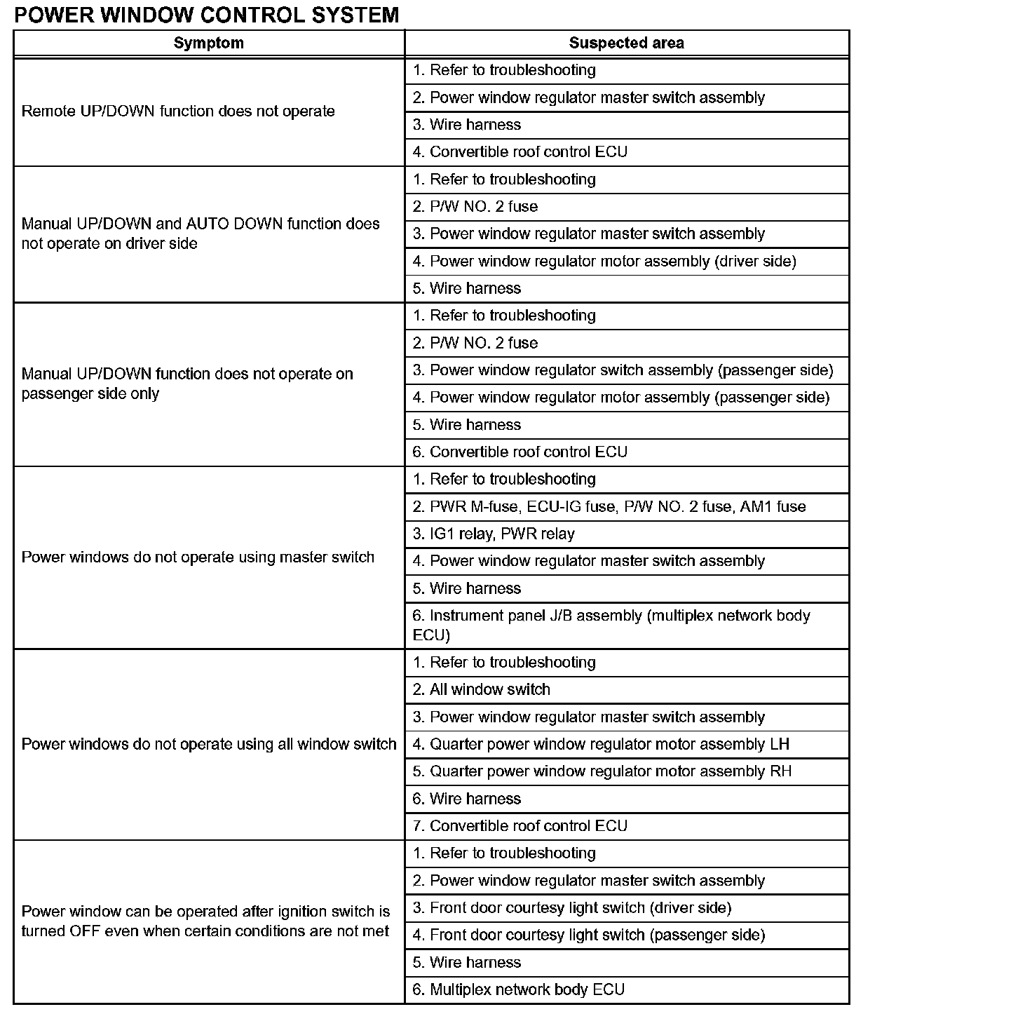 Problem Symptoms Table-Power Window Control System (Convertible):