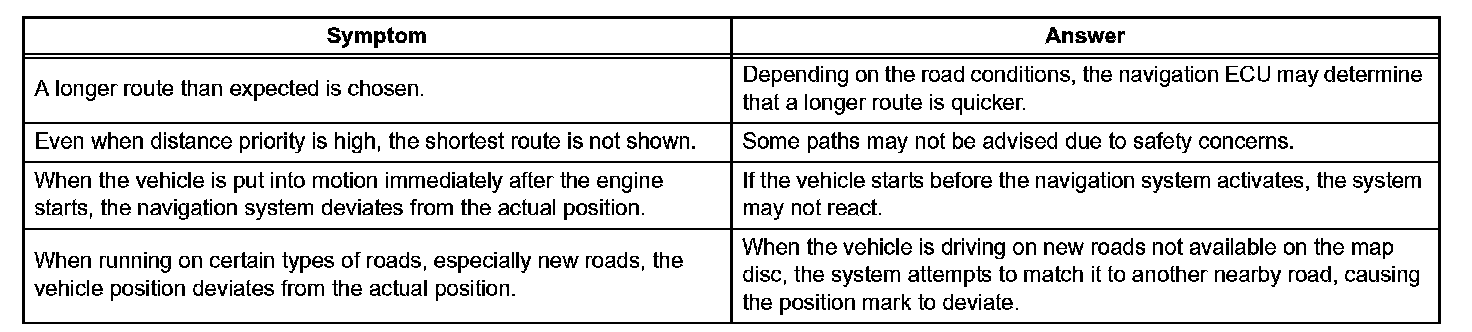 b. The following symptoms are not a malfunction, but are caused by errors inherent in the GPS, gyro sensor, speed sensor, and navigation ECU.