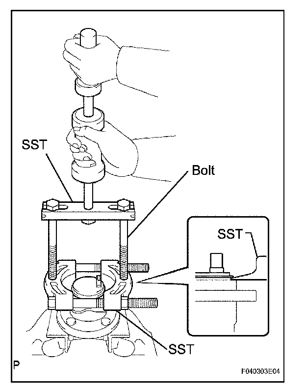 b. Using a pin punch and hammer, drive out the 2 pins and remove the 2 attachments (09521-00010) from SST.