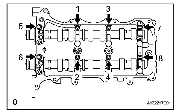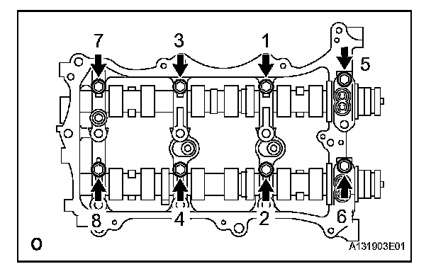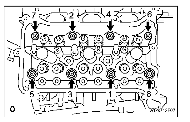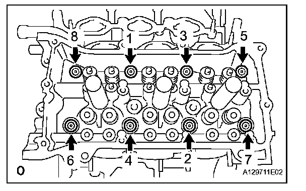Temporarily tighten the 8 bolts in the order shown in the illustration.
