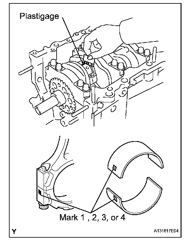 HINT: If replacing a bearing, replace it with one that has the same number as its respective connecting rod cap. Each bearing's standard thickness is indicated by mark 1, 2, 3 or 4 on its surface.