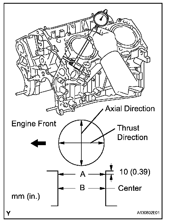 (a) Using a cylinder gauge, measure the cylinder bore diameter at positions A and B in the thrust and axial directions.
