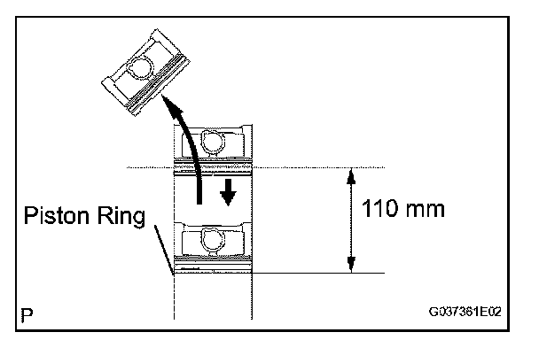 (b) Using a piston, push the piston ring a little beyond the bottom of the ring travel, 110 mm (4.33 in.) from the top of the cylinder block.