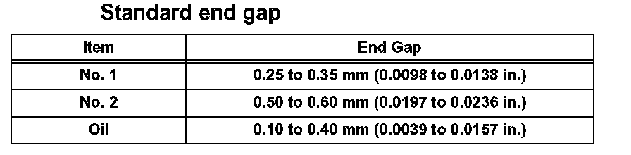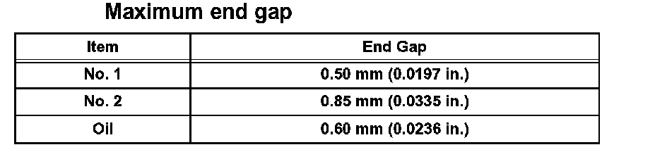 If the end gap is greater than the maximum, replace the piston ring. If the end gap is greater than the maximum, even with a new piston ring, replace the cylinder block.