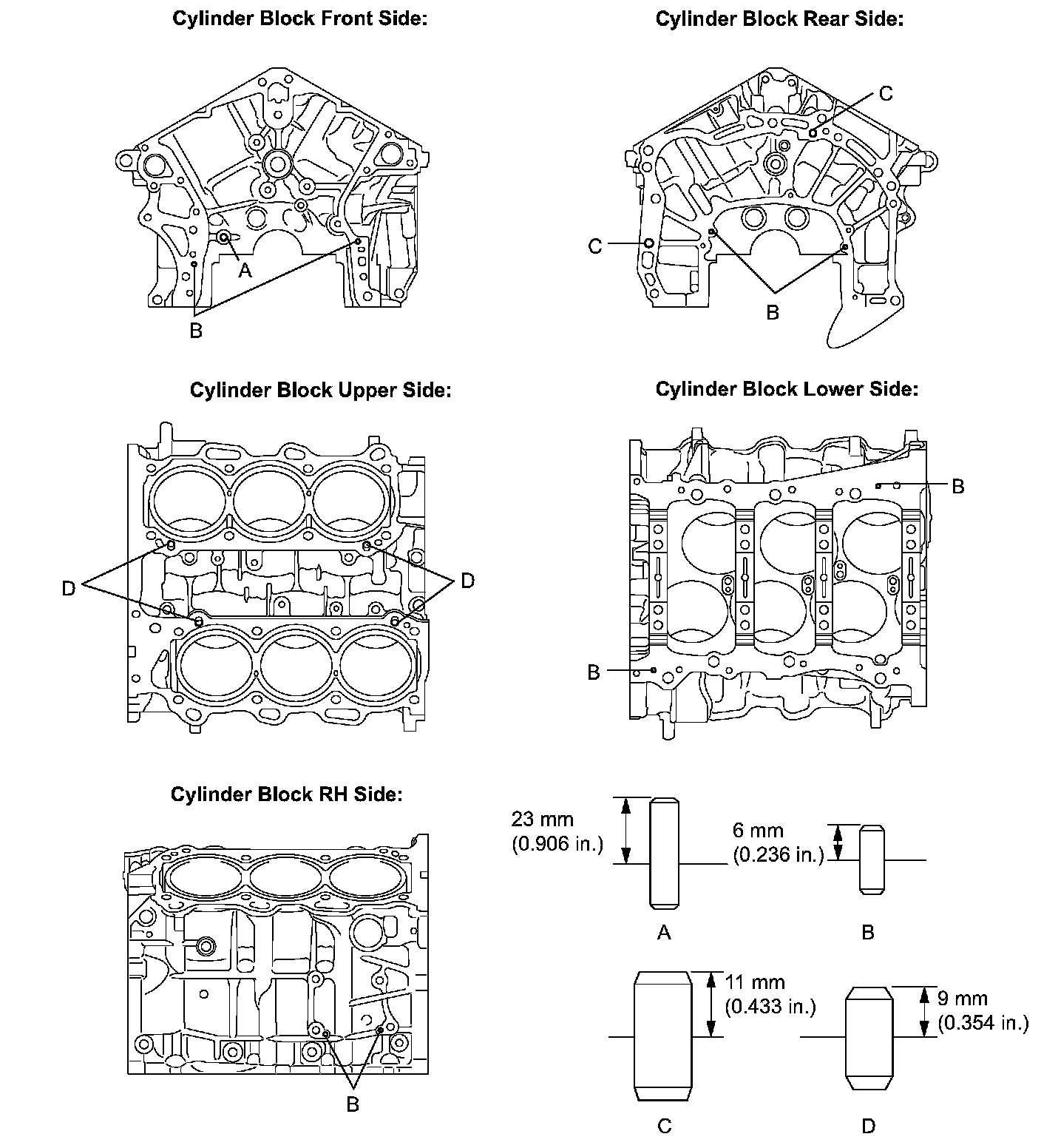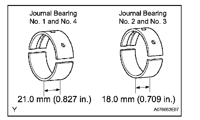 NOTICE: Main bearings come in widths between 18.0 mm (0.709 in.) and 21.0 mm (0.827 in.). Install the 21.0 mm (0.827 in.) bearings in the No. 1 and No. 4 cylinder block journal positions with the main bearing cap. Install the 18.0 mm (0.709 in.) bearings in the No. 2 and No. 3 positions.