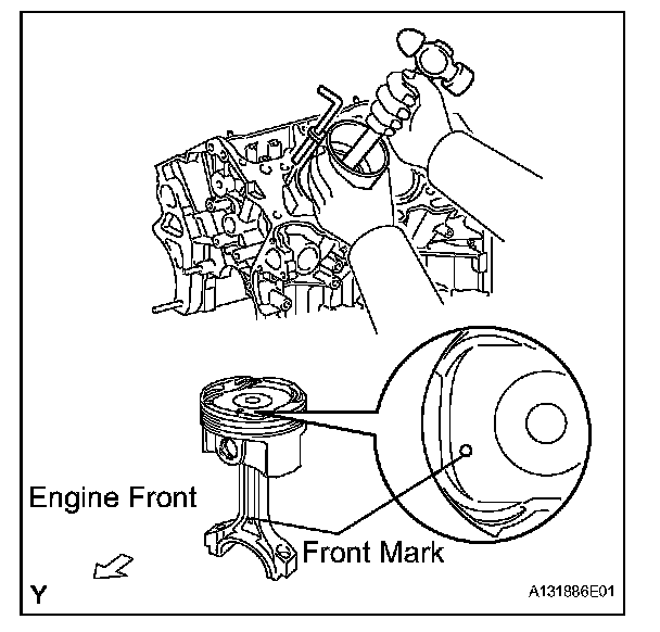 (c) Using a piston ring compressor, push the correctly numbered piston and connecting rod assembly into the cylinder with the front mark of the piston facing forward.