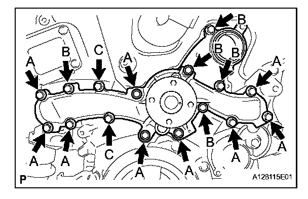 Install a new water pump gasket and the water pump assembly with the 16 bolts.