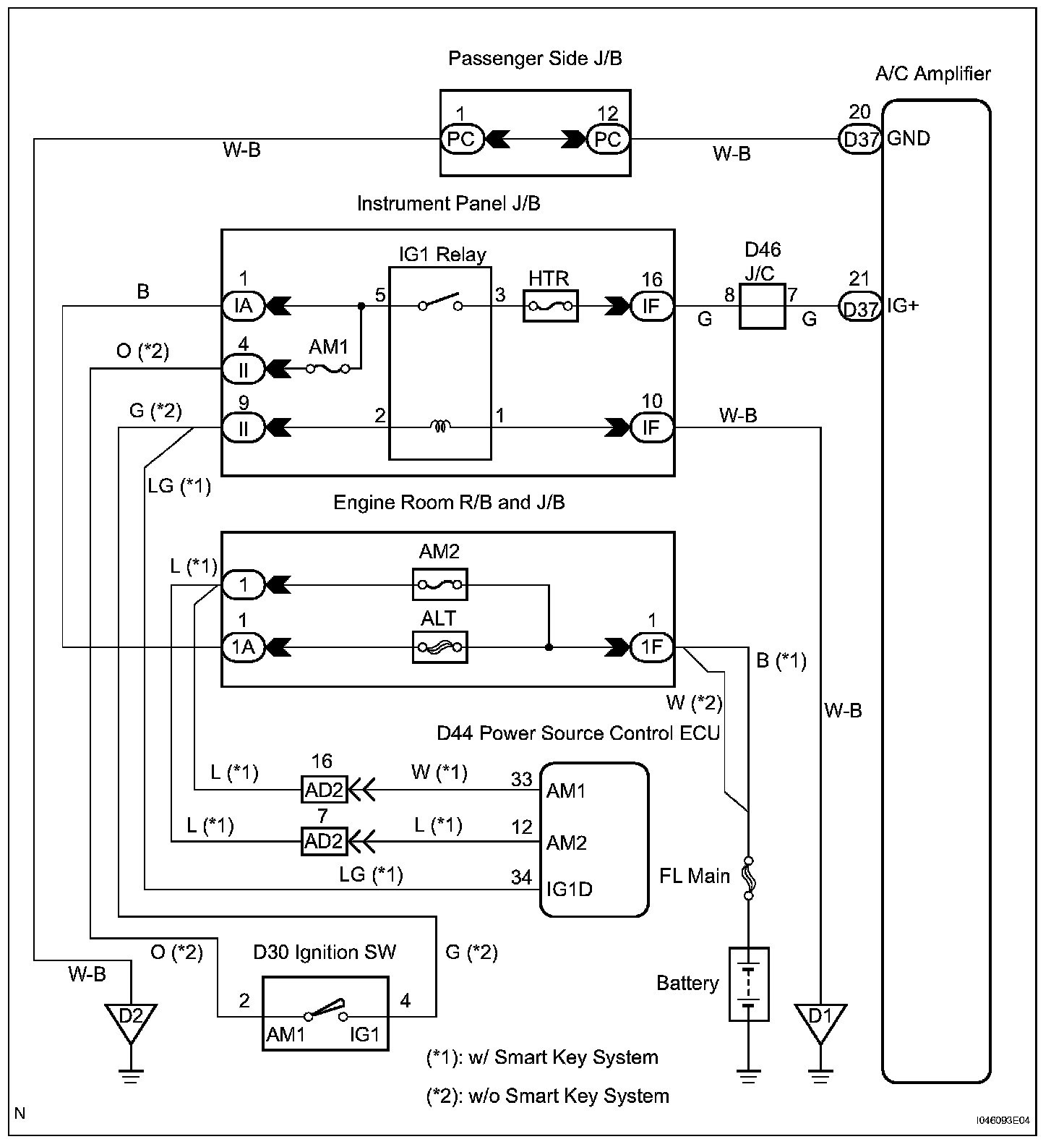 The main power source is supplied to the A/C amplifier when the ignition switch is turned to the on (IG). The power source supplied is used for operating the A/C amplifier and servomotor, etc.