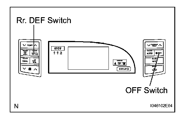 2. If mode indication is different from the actual air outlet in actuator check, turn the ignition switch on (IG) while pressing the "Rr, DEF" and "OFF" switches simultaneously. Step motor initialization occurs and the "FRONT DEF" indicator blinks.