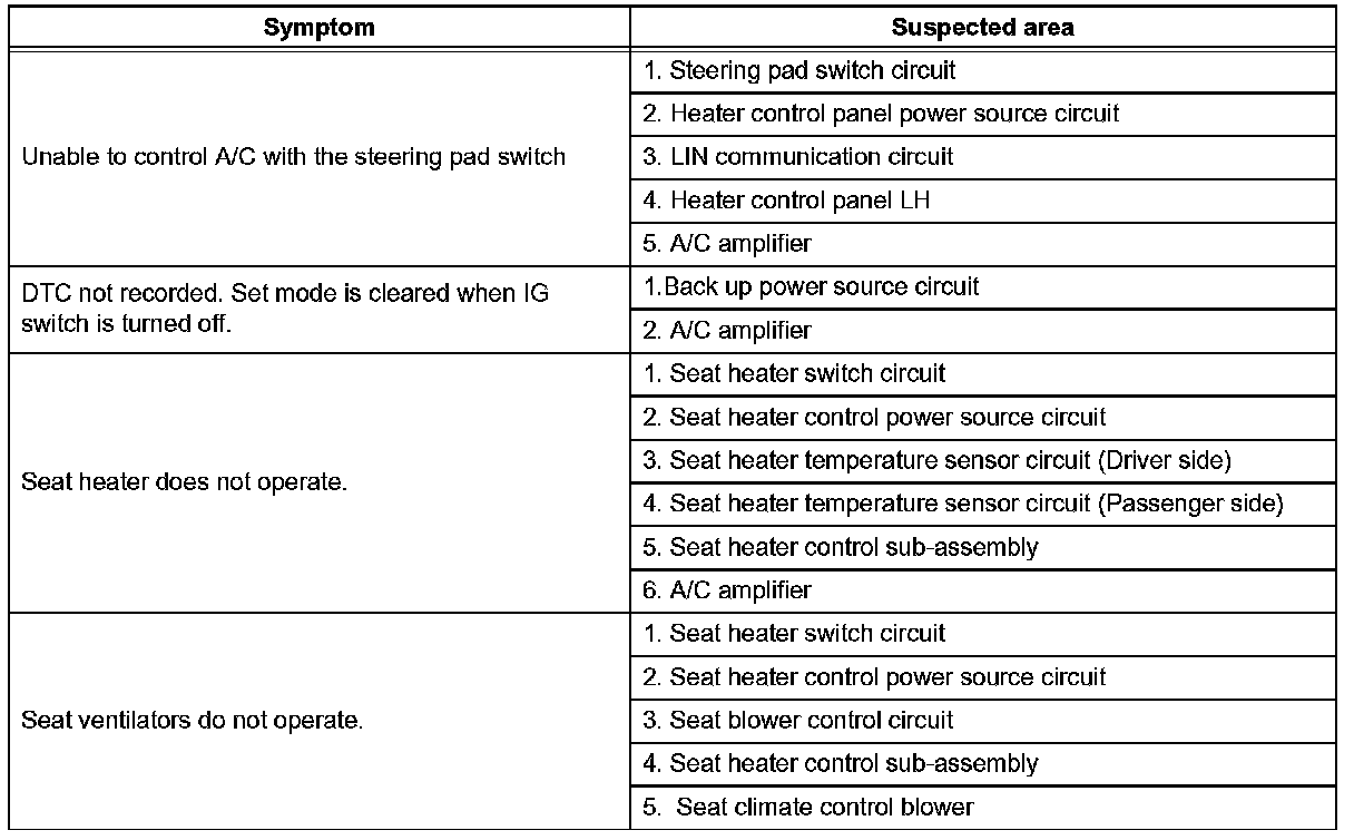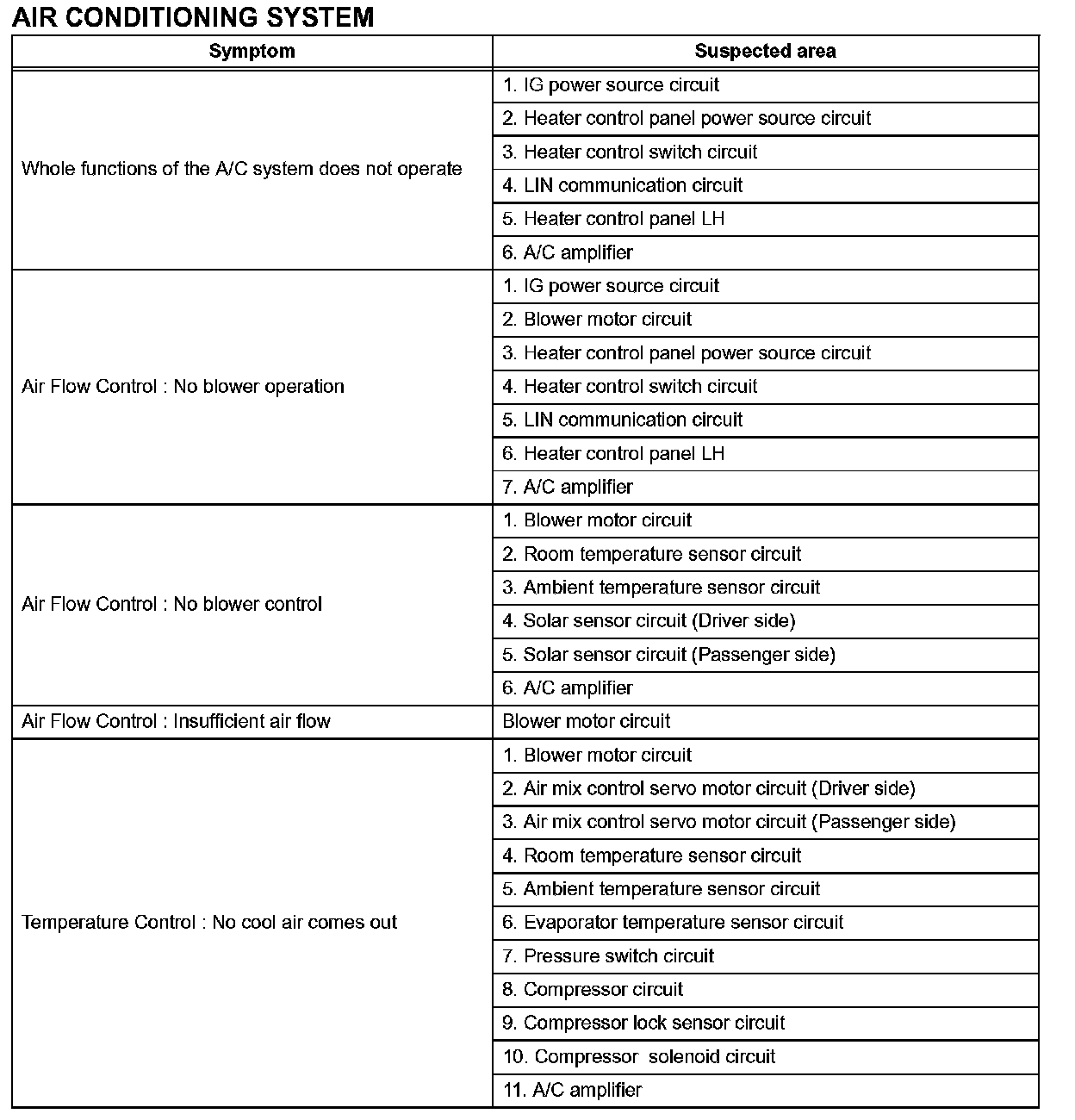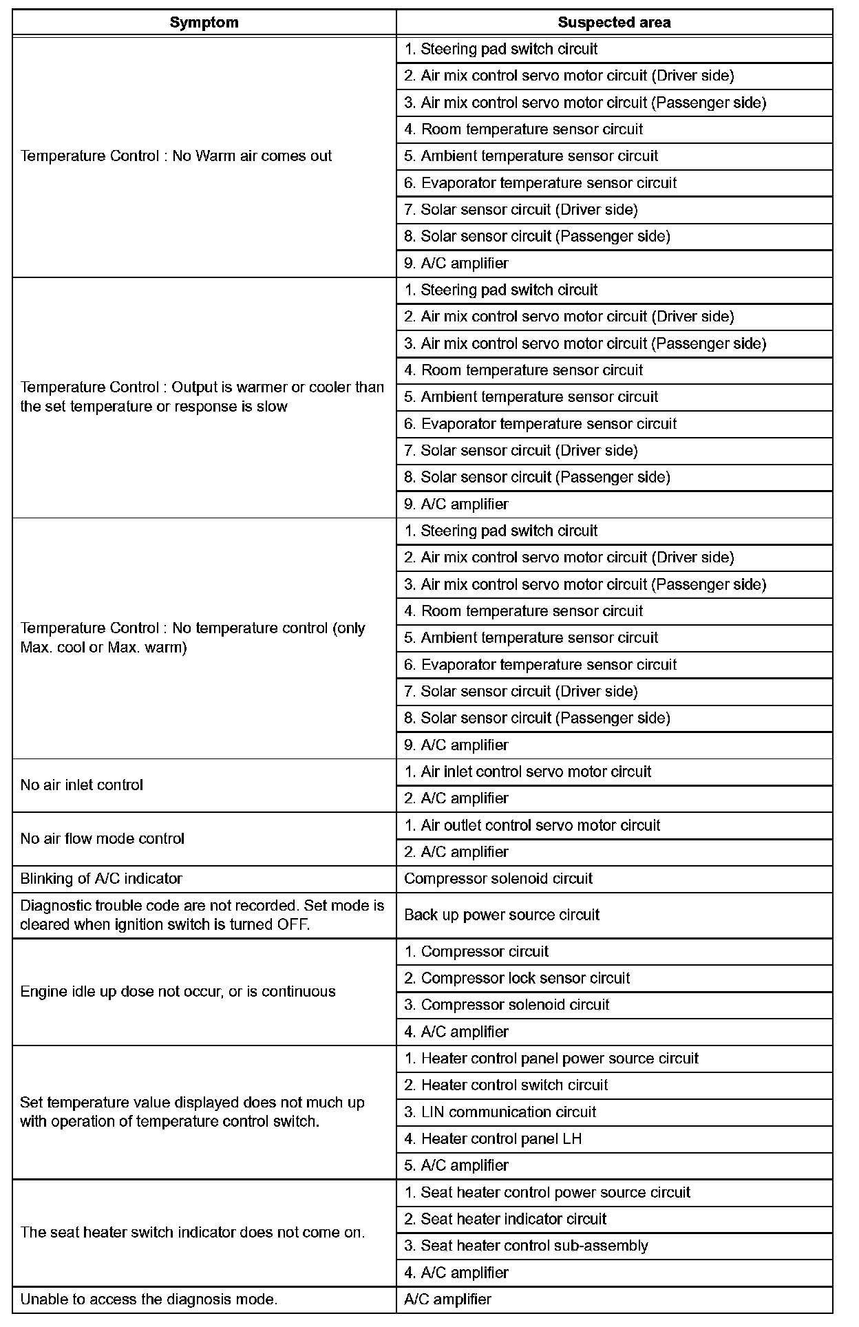 PROBLEM SYMPTOMS TABLEIf a normal system code is displayed during the DTC check but the problem still occurs, check the circuits for each problem symptom in the order given in the table and proceed to the relevant troubleshooting.