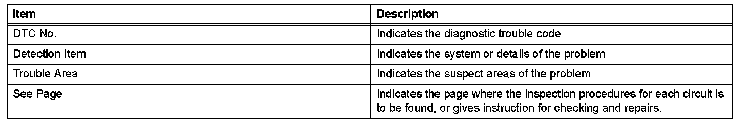 Look for output Diagnostic Trouble Codes (DTCs) (from the DTC checks) in the appropriate section's Diagnostic Trouble Code Chart. Use the chart to determine the trouble area and the proper inspection procedure. A description of each of the chart's columns is shown in the table.