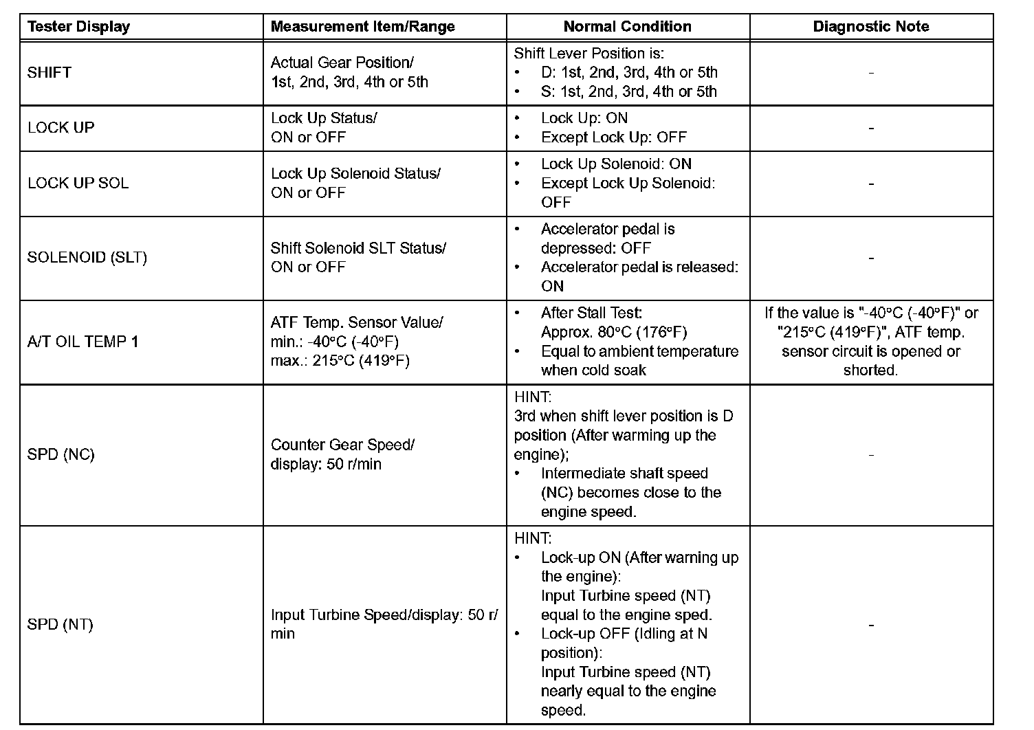 NOTICE: In the table, the values listed under "Normal Condition" are reference values. Do not depend solely on these reference values when deciding whether a part is faulty or not.