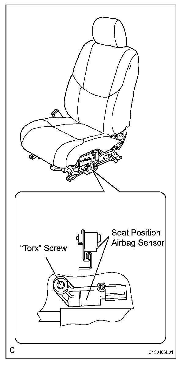 d. Using a "torx" socket wrench, tighten the "torx" screw to install the seat position sensor.