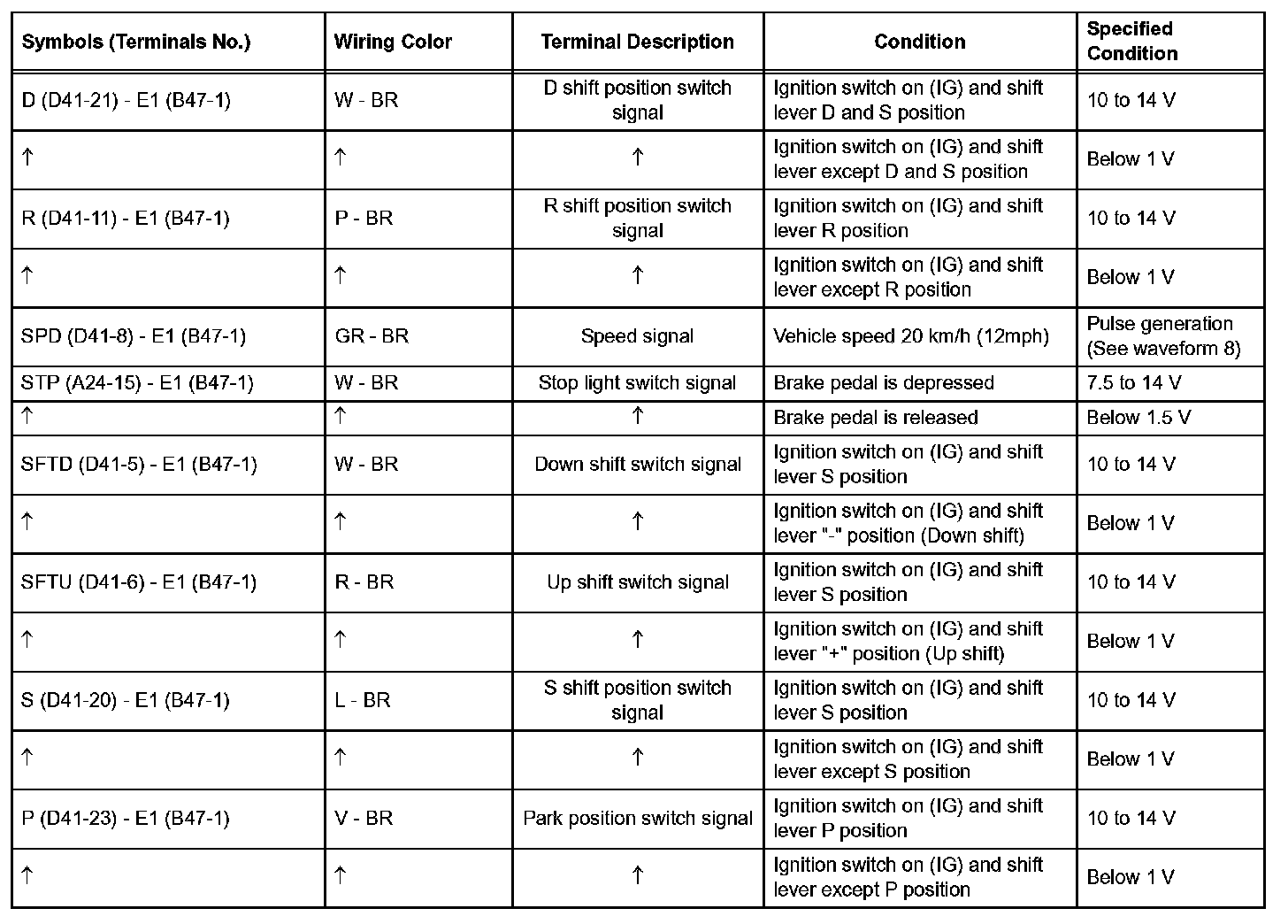 In the table, first follow the information under "Condition". Look under "Symbols (Terminal No.)" for the terminals to inspected. The standard voltage between the terminals is shown under "Specific Condition".