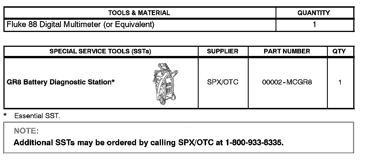 1. Before proceeding, determine the battery state of charge (SOC) using the GR8 Battery Diagnostic Station. If necessary, charge or replace the battery.