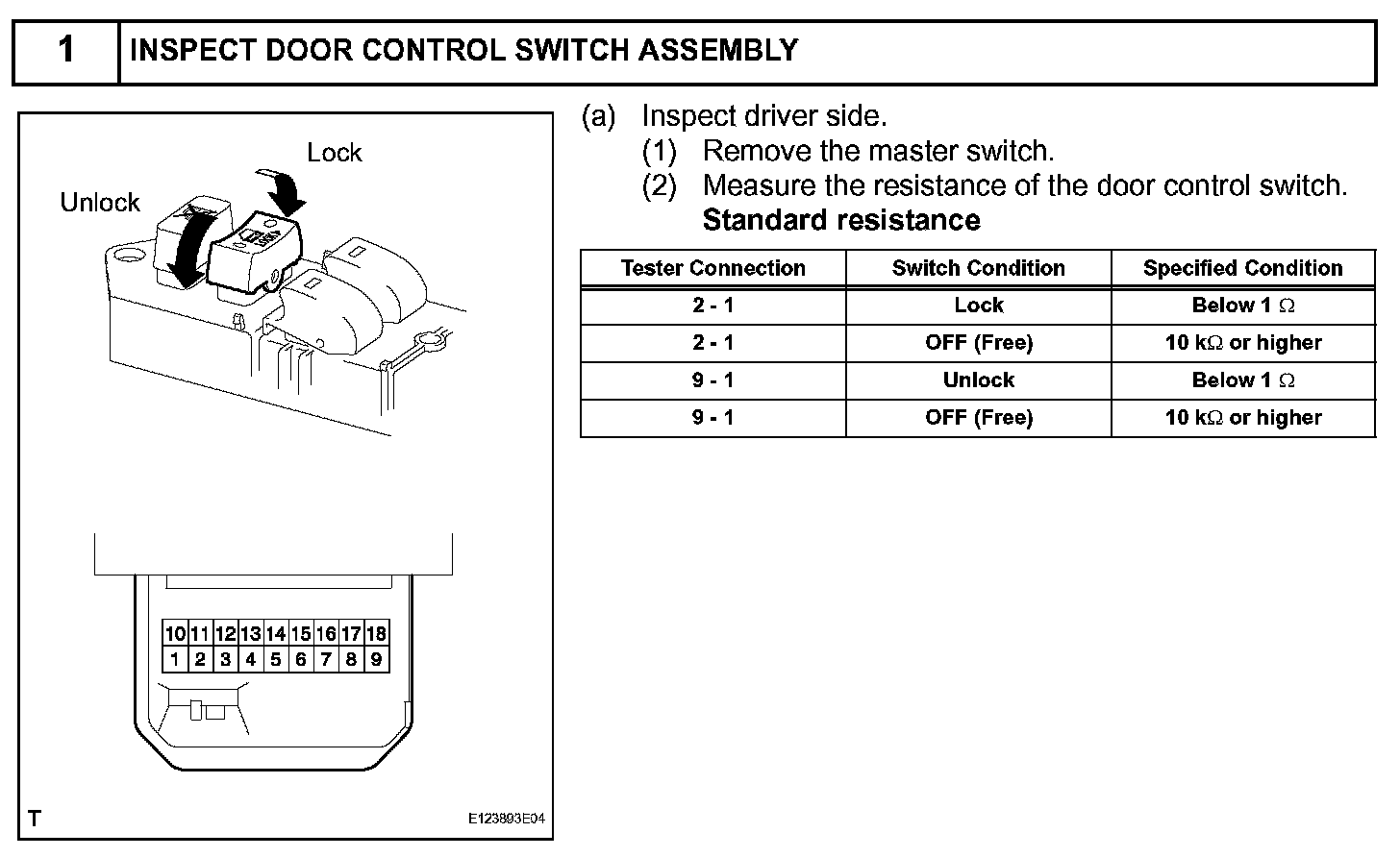the unlock side of the switch is pressed, continuity is established between terminal 9 (driver side) or 2 (passenger side) and terminal 1 (driver side) or 3 (passenger side).