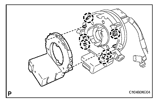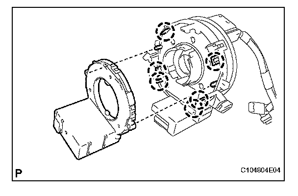 a. Align the locating pins, engage the claws, and install the steering angle sensor to the spiral cable subassembly.