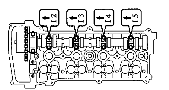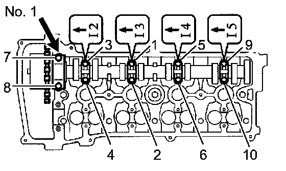 Examine the front marks and numbers, and check that the order is as shown in the illustration. Then install the bearing caps into the cylinder head.