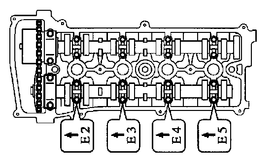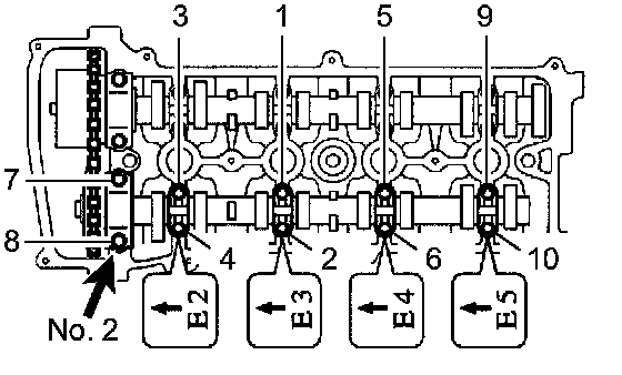 Examine the front marks and numbers, and check that the order is as shown in the illustration. Then install the bearing caps onto the cylinder head.