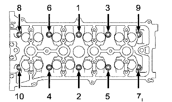 Retighten the cylinder head bolts 90° in the sequence shown in the illustration.