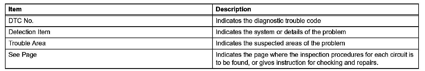 Look for output Diagnostic Trouble Codes (DTCs) (from the DTC checks) in the appropriate section's Diagnostic Trouble Code Chart. Use the chart to determine the trouble area and the proper inspection procedure. A description of each of the chart's columns is shown in the table.