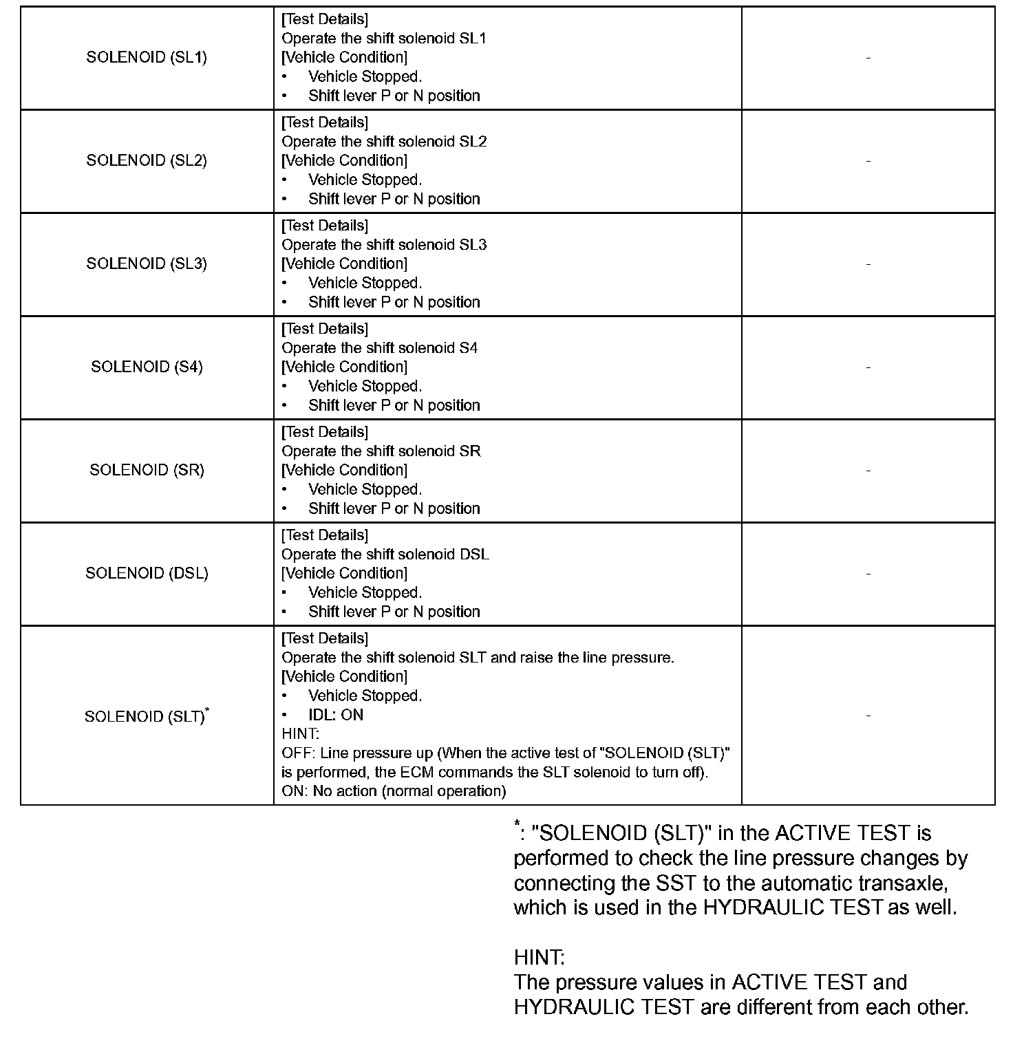 *: "SOLENOID (SLT)" in the ACTIVE TEST is performed to check the line pressure changes by connecting the SST to the automatic transaxle, which is used in the HYDRAULIC TEST as well.