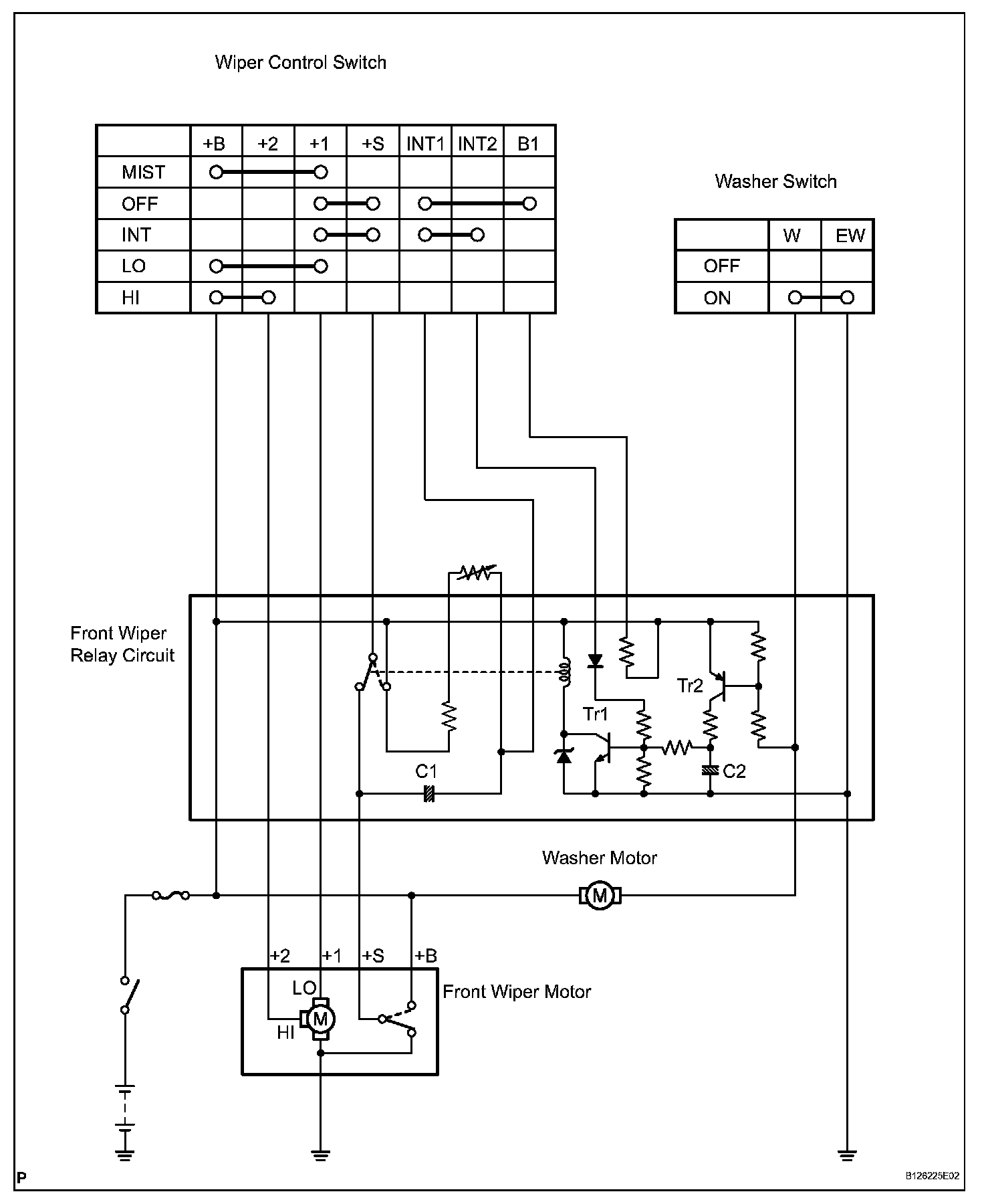 b. If the wiper control switch is turned to the INT position, current flows from the already charged capacitor C1 to Tr1 (transistor) through terminals INT1 and INT2 of the wiper control switch. When Tr1 turns on, current flows from terminal +S of the wiper control switch to terminal +1 of the wiper control switch, to terminal +1 of the wiper motor, to the wiper motor and finally to the ground, causing the wiper motor to operate. At the same time, current flows from capacitor C1 to terminal INT1 of the wiper control switch and then INT2. When the current flow from capacitor C1 ends, Tr1 turns off to stop the relay contact point and halt the wiper motor.